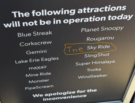 On the other hand, I wonder if there's ever been consideration to have Skyride refurbished and modernized, particularly to have the cabins move automatically through the station once detached from the haul rope, which would potentially free up some ride op slots. I also imagine modernized parts would probably be able to have a higher wind tolerance, though that admittedly might not affect the park's approach to it.