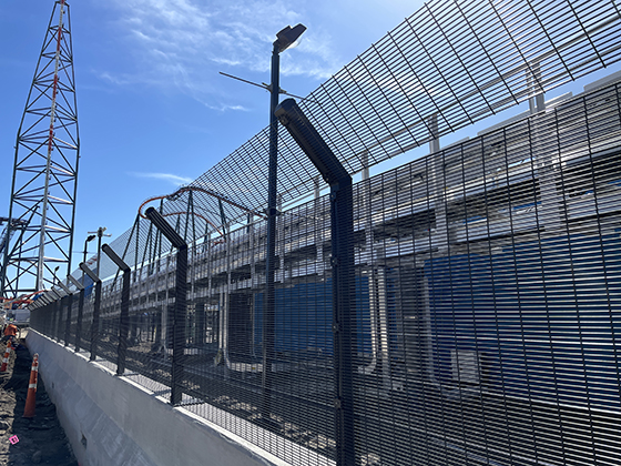I wonder why they chose to angle it outwards rather than inwards. I would imagine if it was a safety feature such as is customary at many tracks, it would angle inwards to assist in harnessing any flying debris. For the many years that the crews where I worked set up the track for the races it was mandated to face inward.